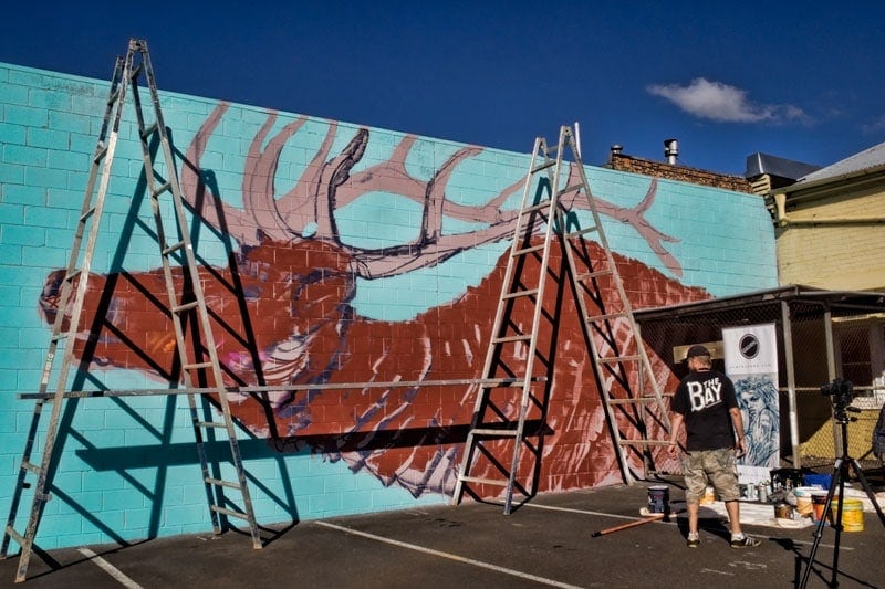 Gimiks Born painting here is a favourite artist for his previous year’s mural featuring a girl holding a  swan.  Knowing he only had a couple of hours to go on the moose at this point before the family headed back to Brisbane I was amazed at the detail in the finished mural, you can see it on his linked Instagram account.  Next time we’re in the area we’ll definitely pop back to see the finished version.
